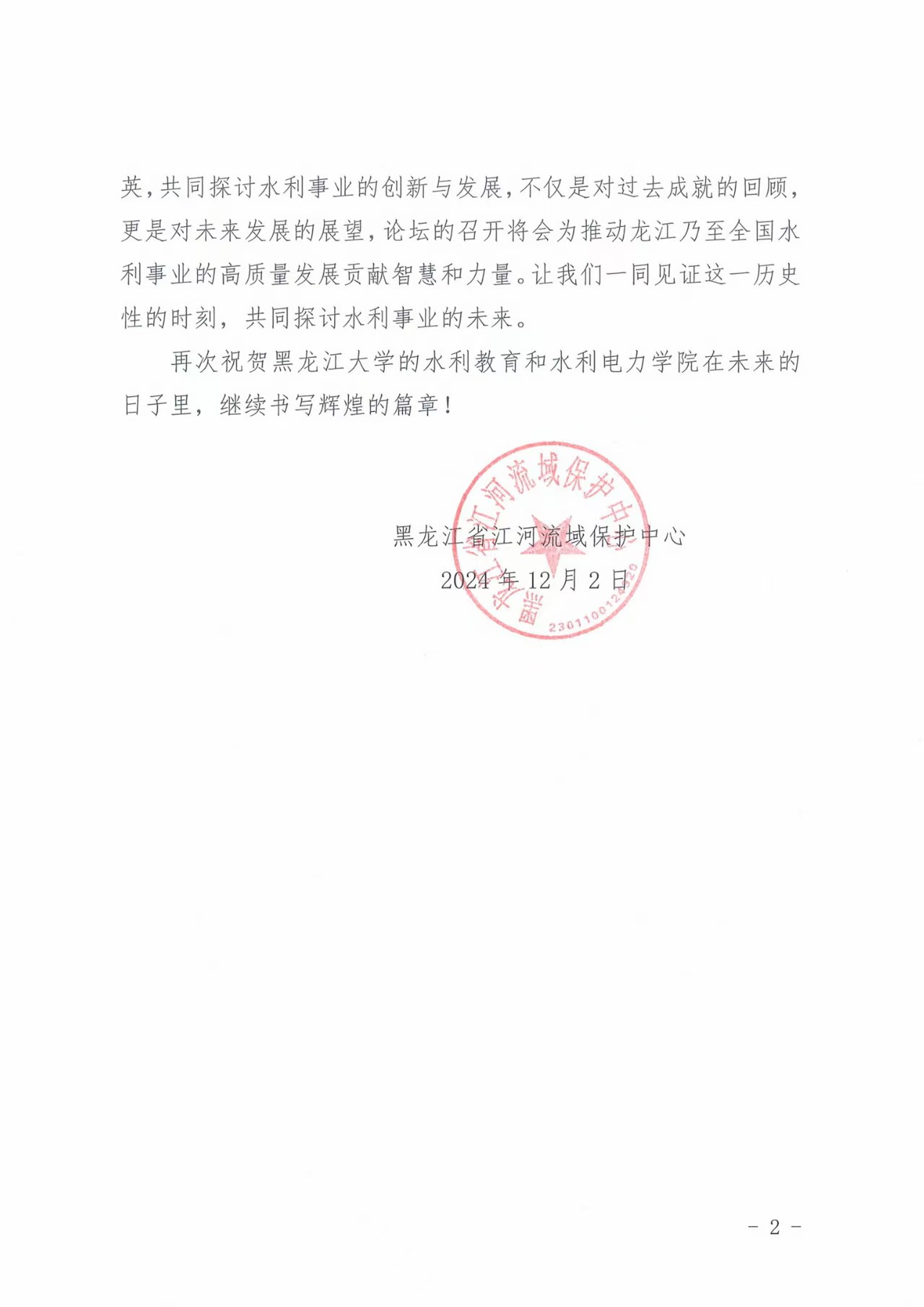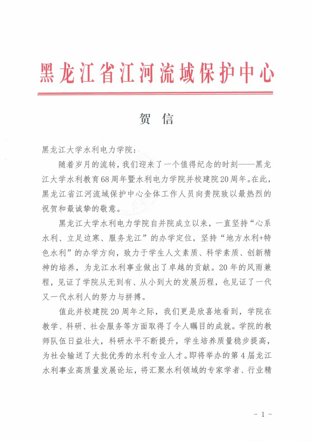 黑龙江省江河流域保护中心向公司发来贺信