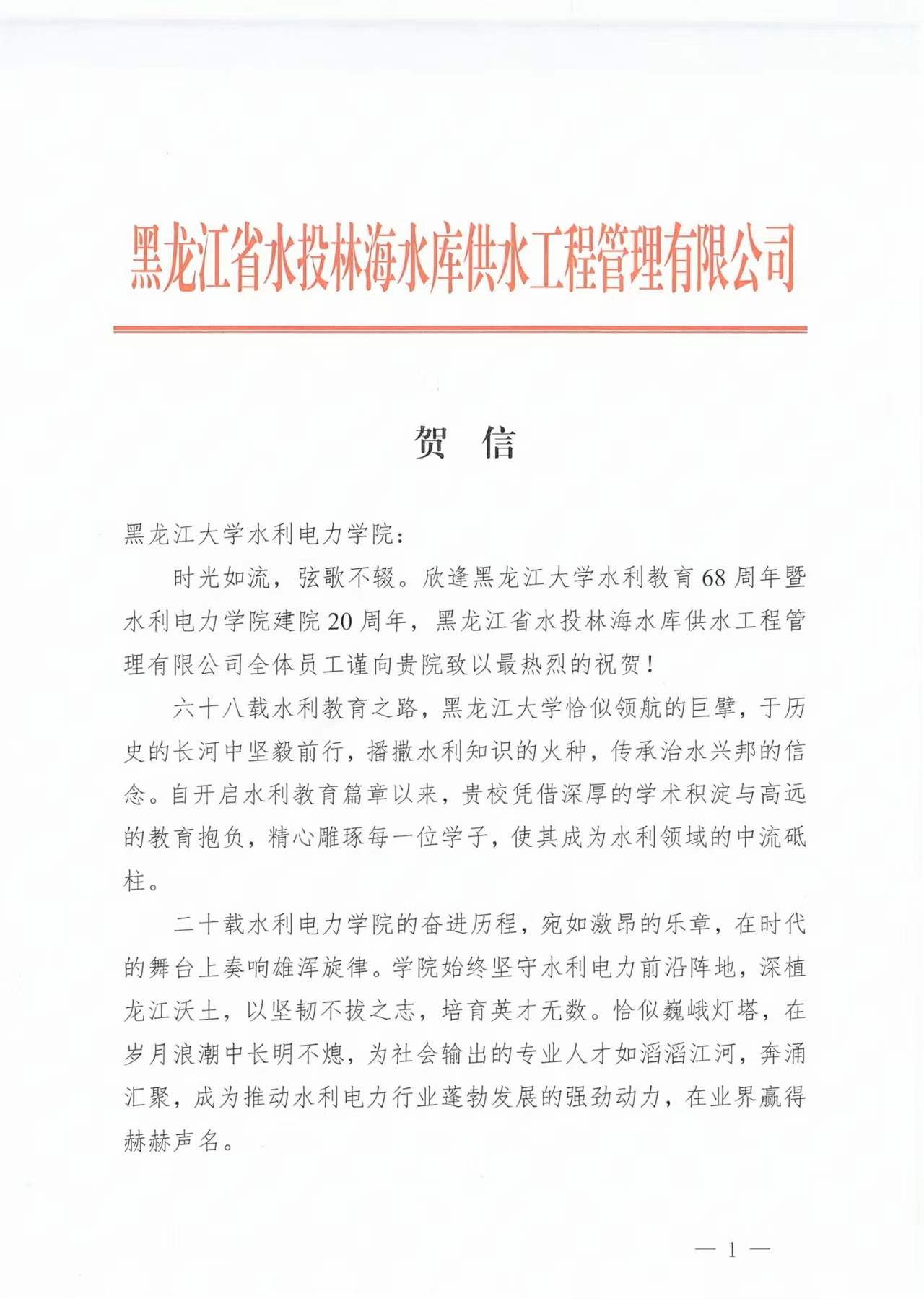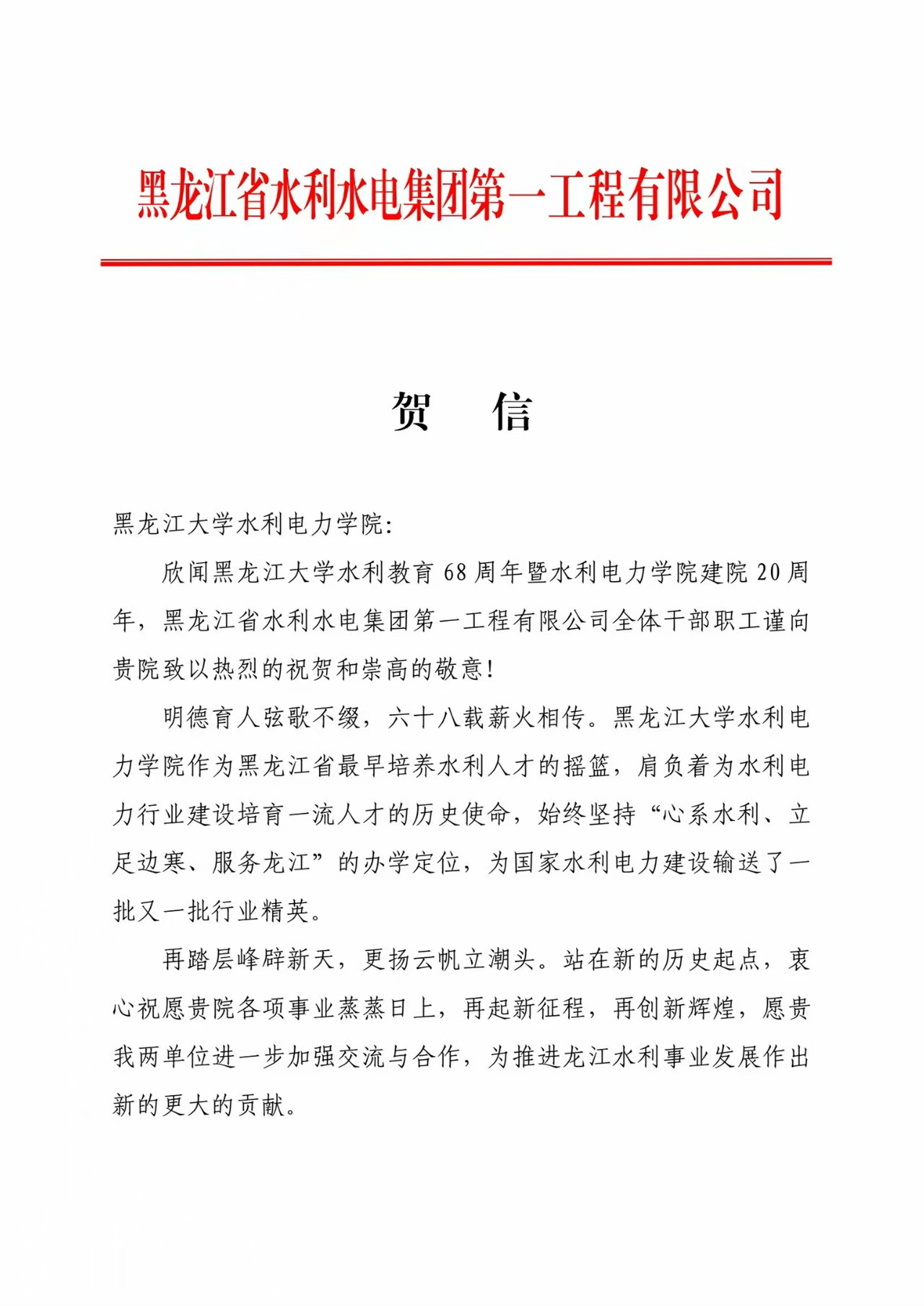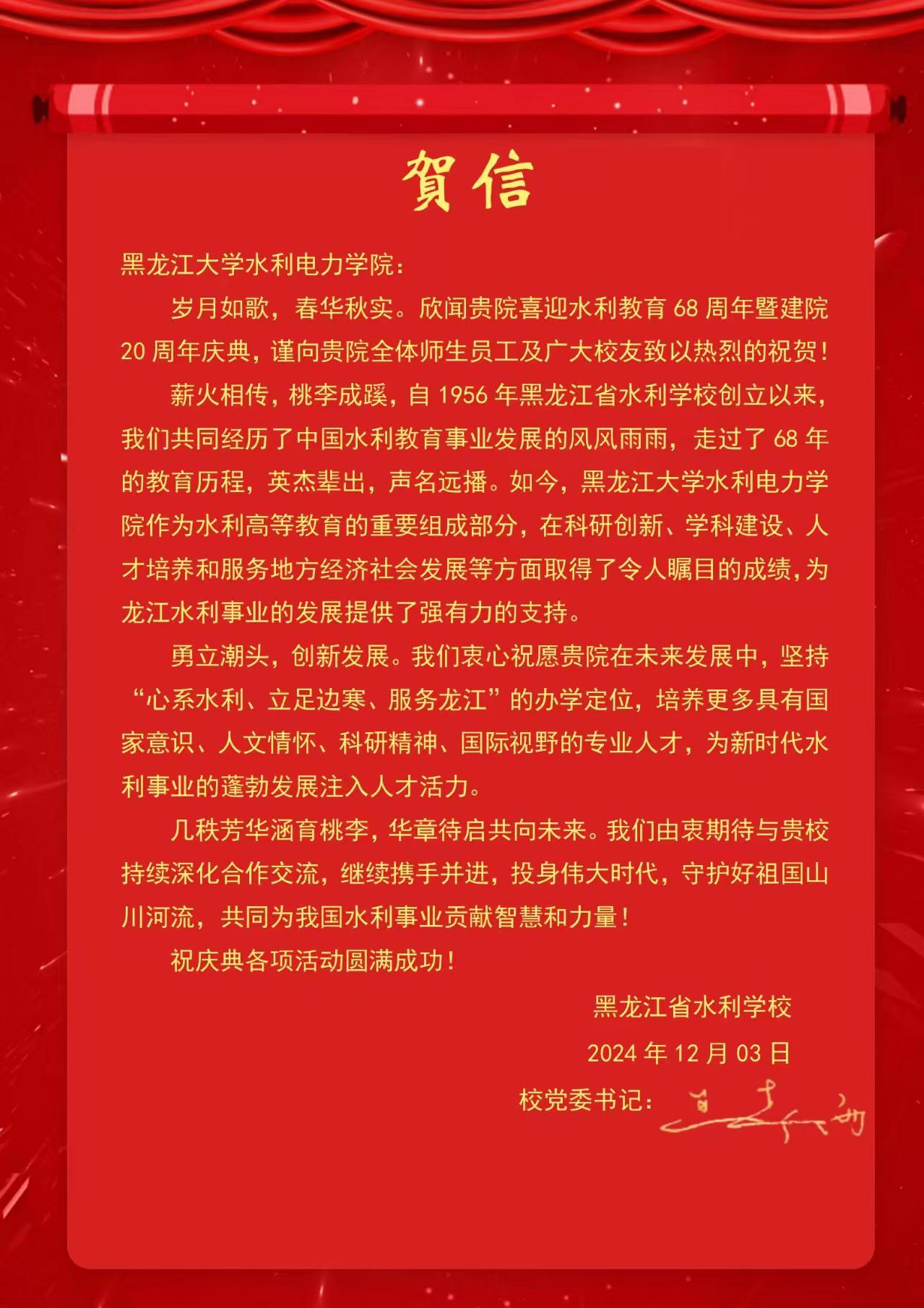 黑龙江省江河流域保护中心向公司发来贺信