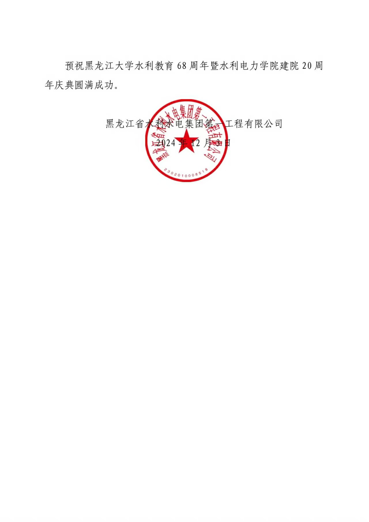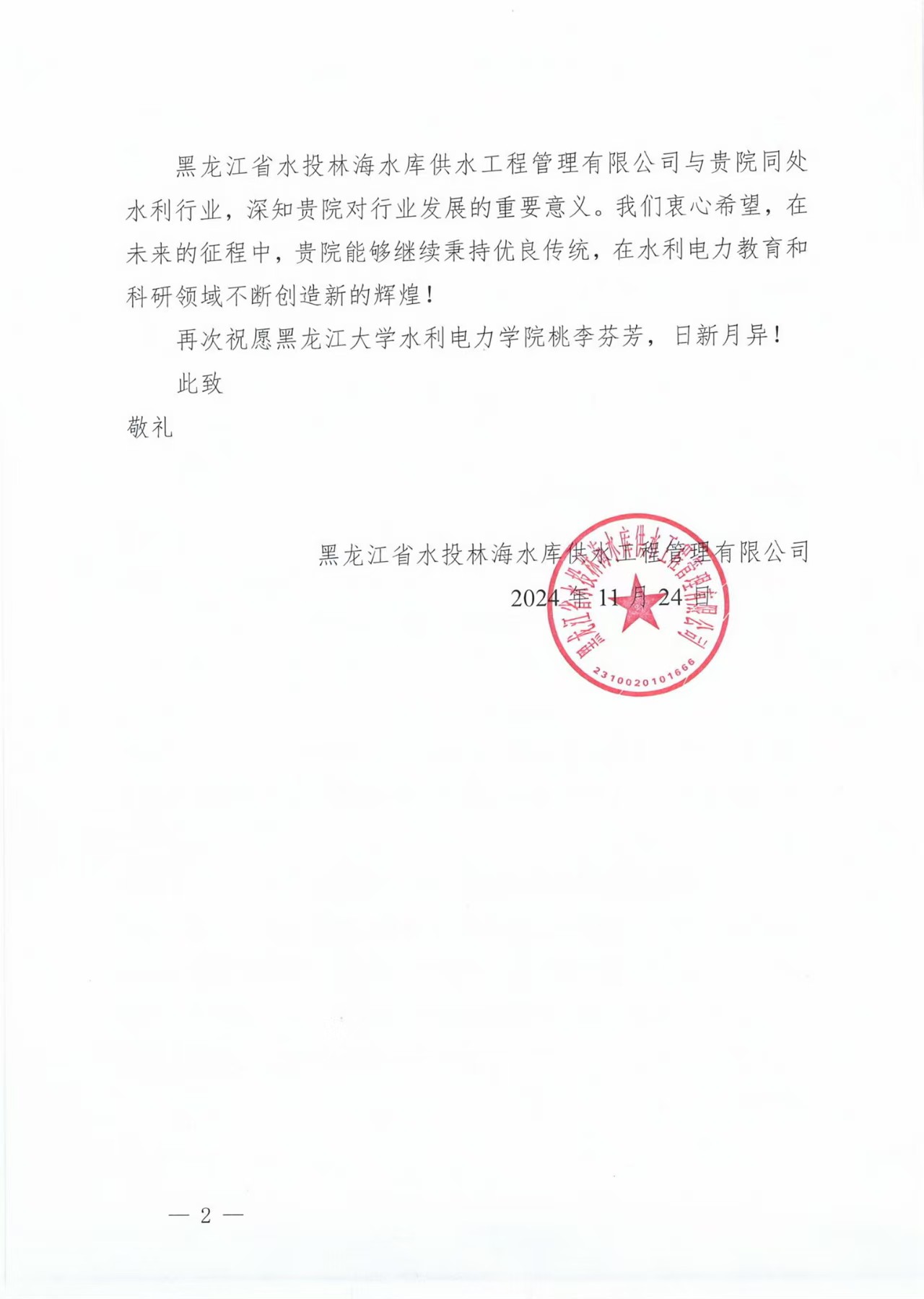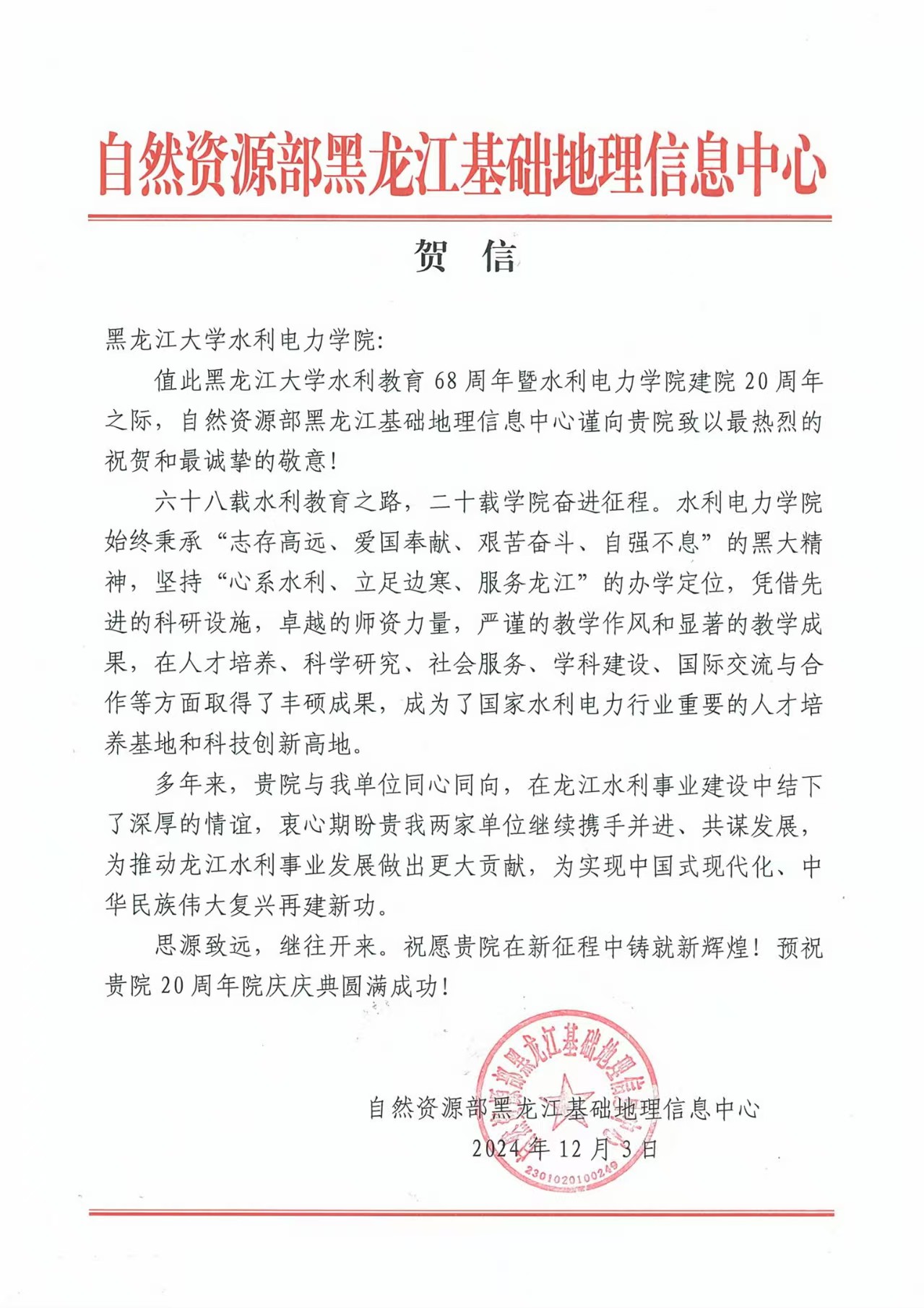黑龙江省江河流域保护中心向公司发来贺信