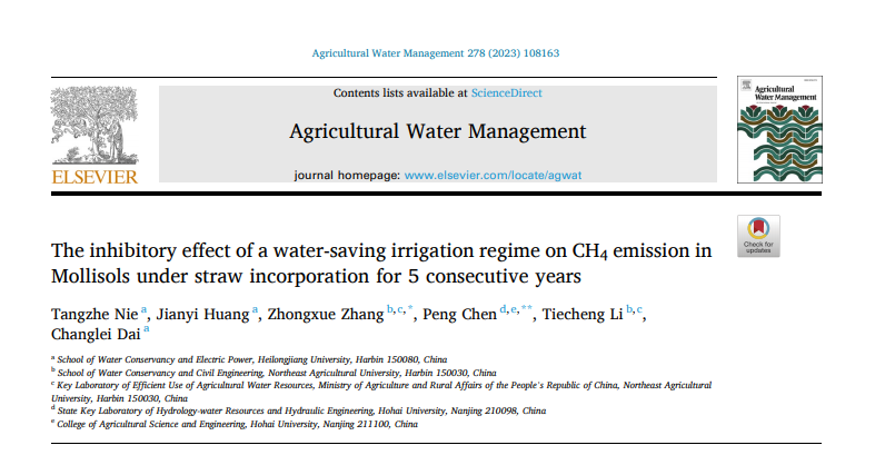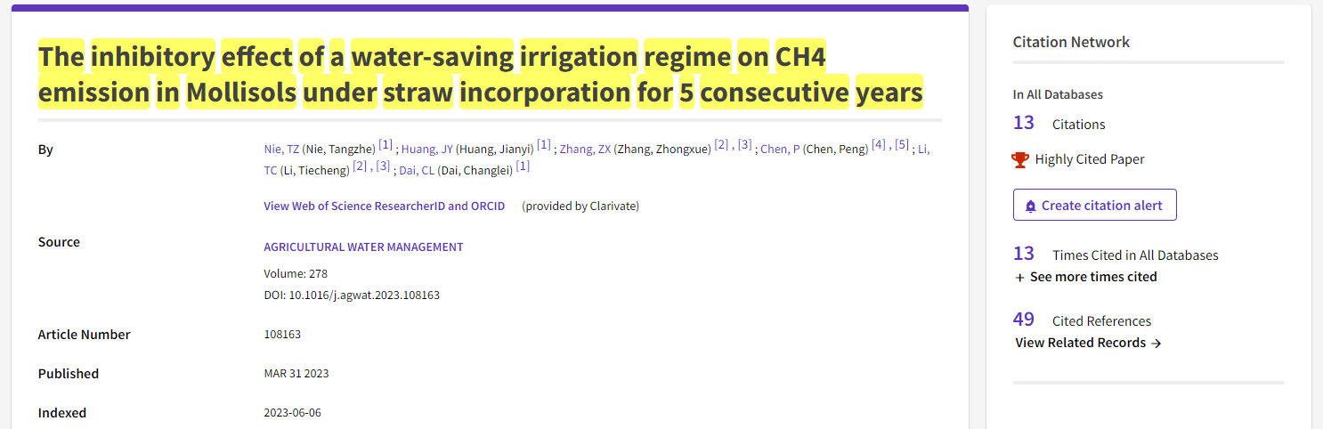 根据汤森路透ESI 2023年9月25日和11月15日数据显示,以水利电力公司教师聂堂哲为第一作者发表的论文“The inhibitory effect of a water-saving irrigation regime on CH4 emission in Mollisols under straw incorporation for 5 consecutive years”连续入选农业科学领域ESI全球TOP1%高被引论文(Highly Cited Paper),ylzzcom永利线路检测中心为第一署名单位。该论文于2023年1月正式发表在国际期刊《Agricultural Water Management》(中科院1区TOP,IF=6.6),至今被引用13次,这是公司教师近年来首篇ESI高被引论文。ESI高被引论文是近10年内发表且被引次数排在相应学科领域全球前1%以内的论文,是衡量国际学术水平及影响力的通行重要评价指标之一。该论文的入选充分体现了公司的整体学术研究水平的稳步提升,并日益与国际高水平研究主流接轨。
