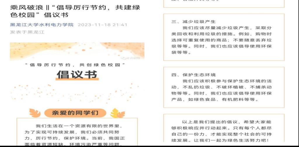 公司官方公众号平台向全体员工发布“倡导厉行节约、共建绿色校园”系列倡议书。内容包括节约用水、节约用电、减少垃圾、保护生态环境等方面,号召同学们从现在做起,从生活习惯做起,从微小处做起,从节约粮食做起,引导员工树立勤俭节约意识,形成“人人讲节约、事事讲节约”的良好氛围。让节约引领风尚,共同为建设文明、和谐、环保的校内和社会环境做出应有的贡献。
