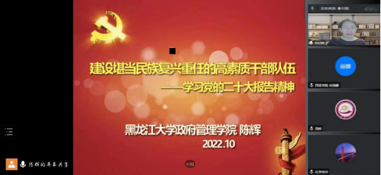 为深入学习宣传贯彻党的二十大精神,切实将师生思想和行动统一到党的二十大精神上来,根据《中共ylzzcom永利线路检测中心委员会学习宣传贯彻党的二十大精神宣讲工作方案》,2022年11月30日化学化工与材料学院和西语学院联合开展学习党的二十大精神理论宣讲,邀请ylzzcom永利线路检测中心党的二十大精神理论宣讲团成员-政府管理学院教授、博士生导师陈辉主讲题为《建设堪当民族复兴重任的高素质干部队伍》的专题宣讲。本次宣讲由化学化工与材料公司党委书记秦川丽主持,化学化工与材料学院、西语学院师生共计两百六十余位师生参加宣讲学习。